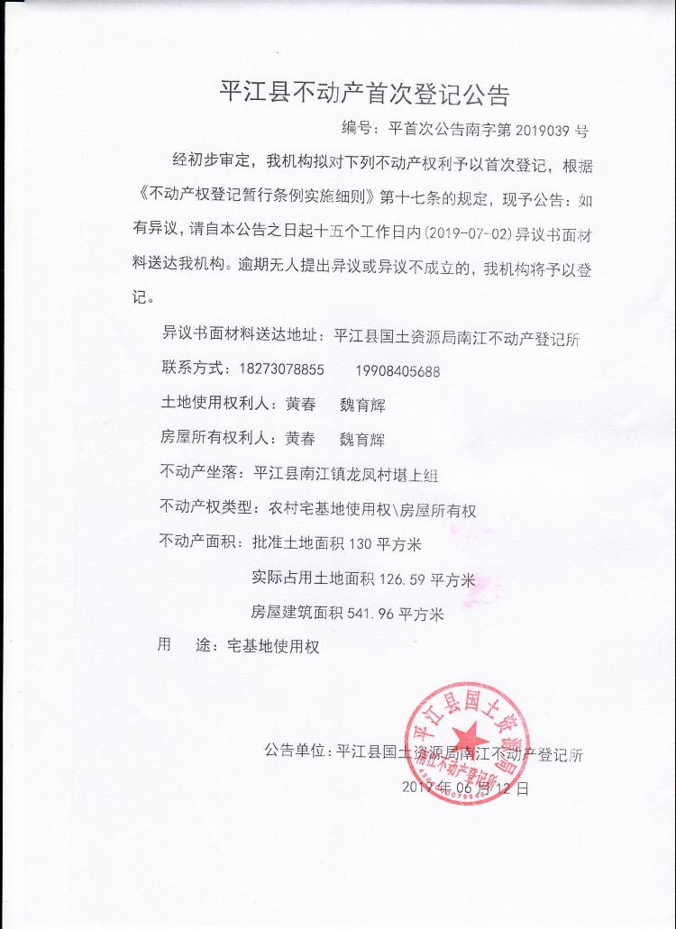 黄春 魏育辉平江县不动产首次登记公告平首次公告南字第2019039号