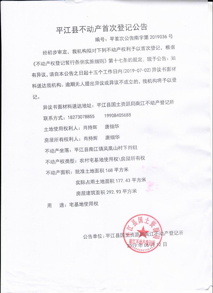 肖持辉 唐细华平江县不动产首次登记公告平首次公告南字第2019036号