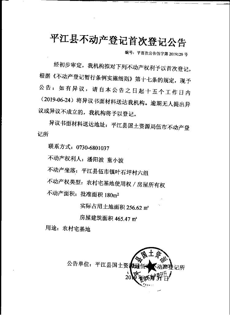 童阳波 童小波 不动产首次登记公告 伍字第2019129号