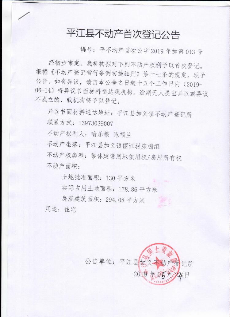 陈福兰 喻乐根平江县不动产首次登记公告平首次加字第2019013号
