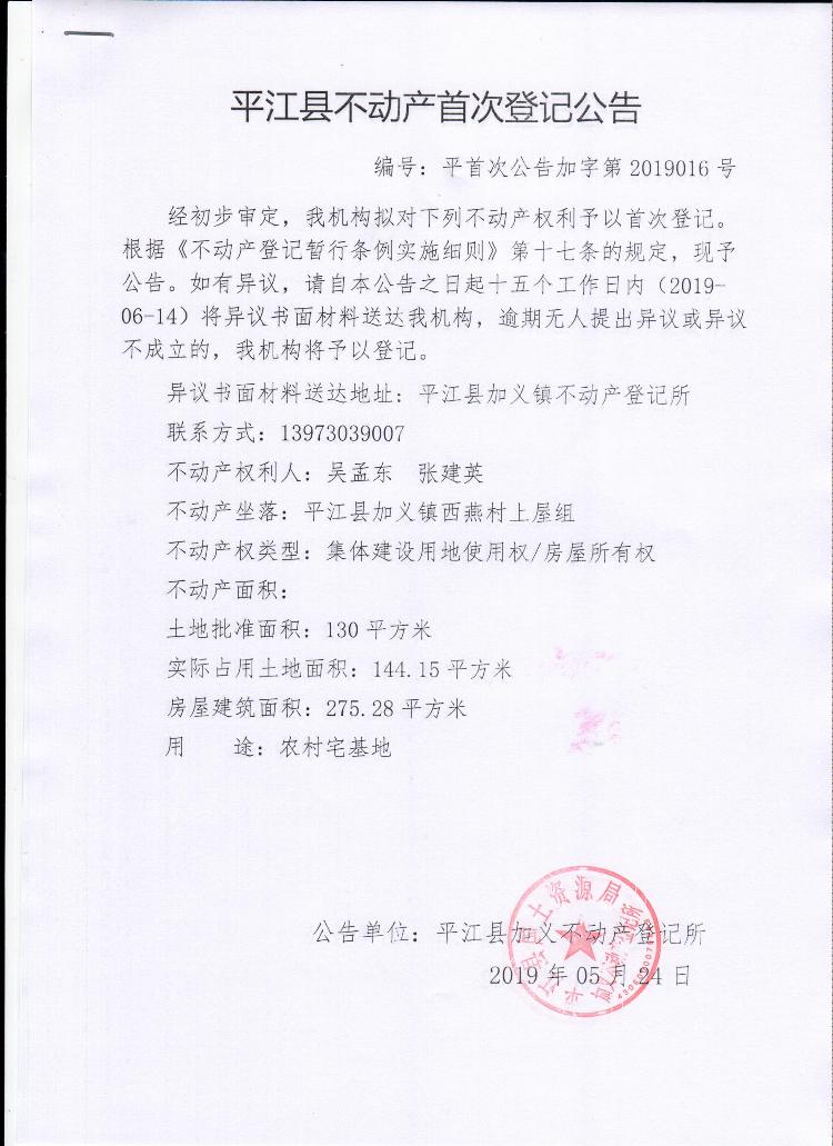 吴孟东 张建英平江县不动产首次登记公告平首次公告加字第2019016