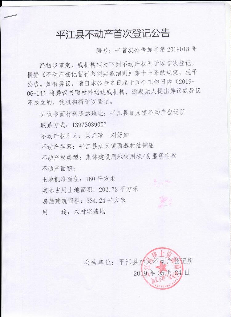 吴洋珍 刘好如平江县不动产首次登记公告平首次公告加字第2019018