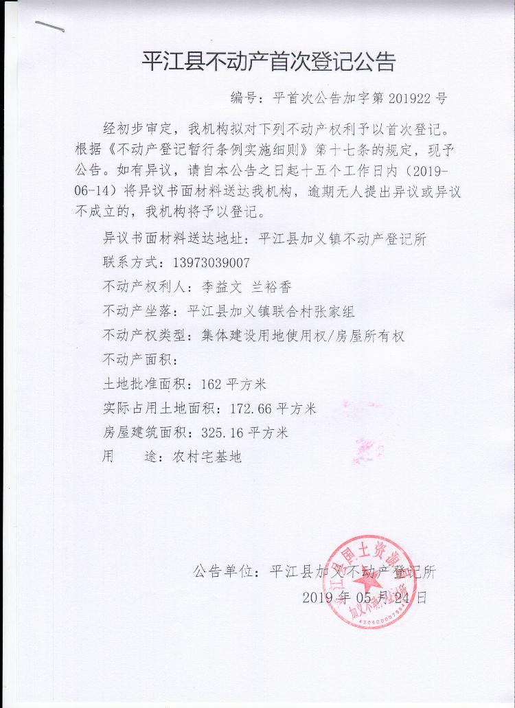 李益文 兰裕香平江县不动产首次登记公告平首次公告加字第201922号