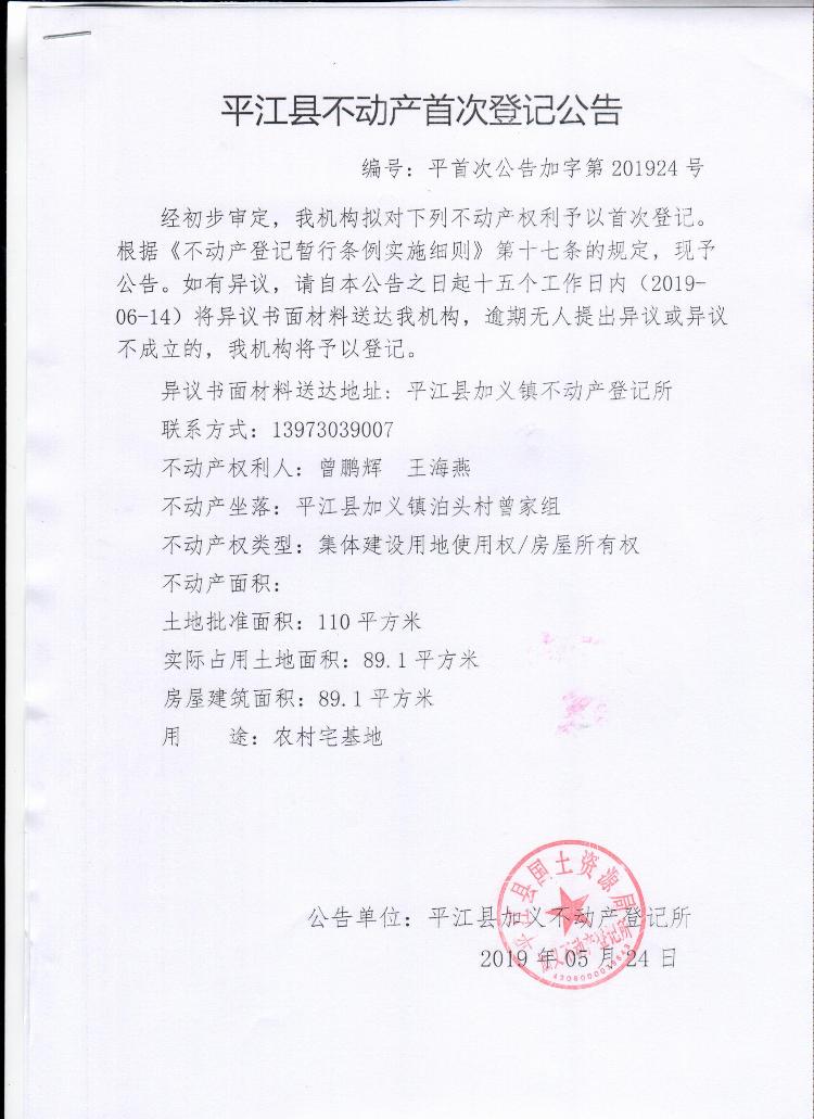 曾鹏辉 王海燕平江县不动产首次登记公告平首次公告加字第201924号