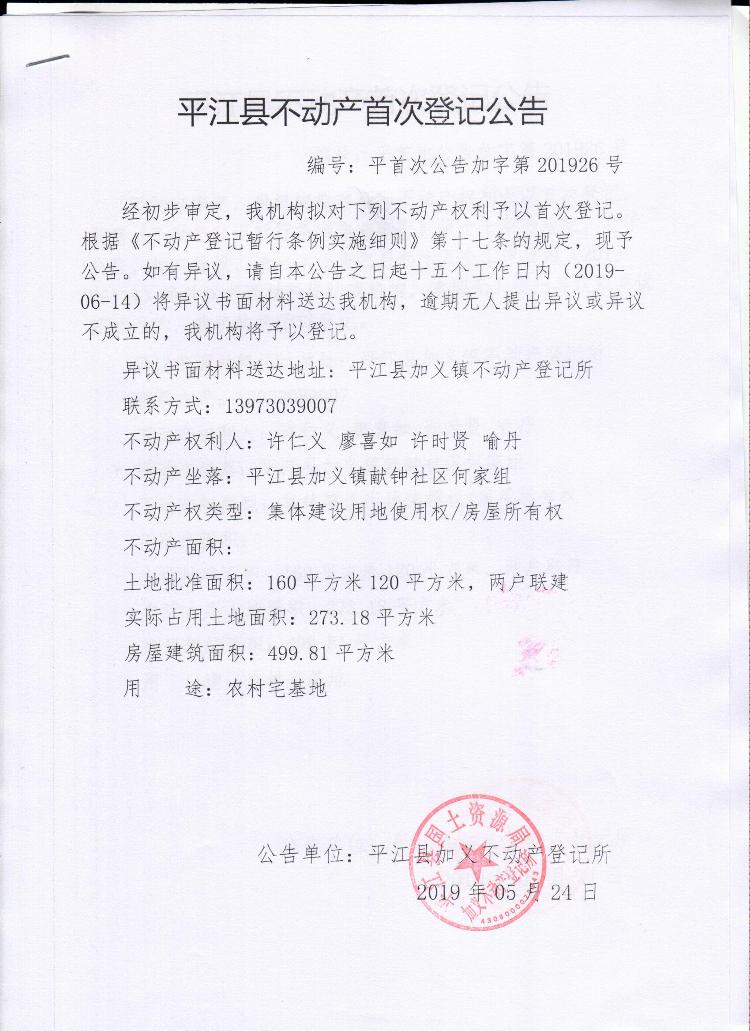 许仁义 廖喜如 许时贤 喻丹平江县不动产首次登记公告平首次公告加字第201926号