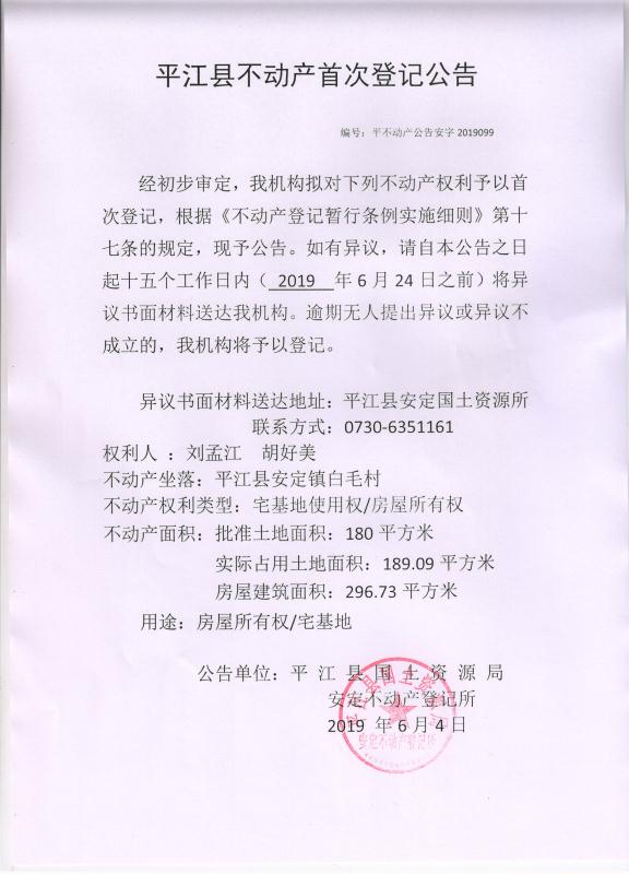 刘孟江 胡好美平江县不动产首次登记公告平不动产公告安字2019099号