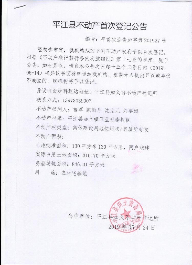 鲁军 陈丽丹 沈克元 刘要娥平江县不动产首次登记公告平首次公告加字第201927号