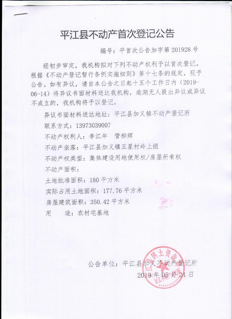 李江年 管柳辉平江县不动产首次登记公告平首次公告加字第201928号