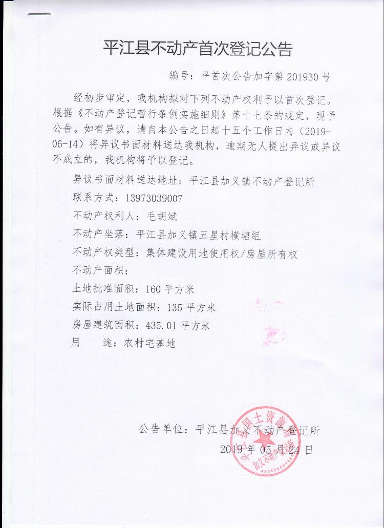 毛胡斌平江县不动产首次登记公告平首次公告加字第201930号