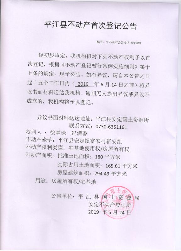 徐掌珠 冯满香平江县不动产首次登记公告平不动产公告安字第2019089号
