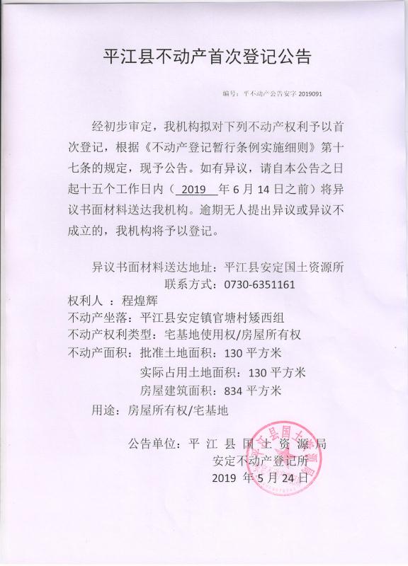 程煌辉平江县不动产首次登记公告平不动产公告安字第2019091号