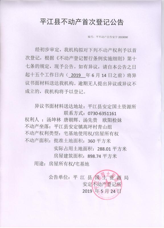 汤坤林 唐朝辉 汤先贵 欧阳检妹平江县不动产首次登记公告平不动产公告安字第2019090号