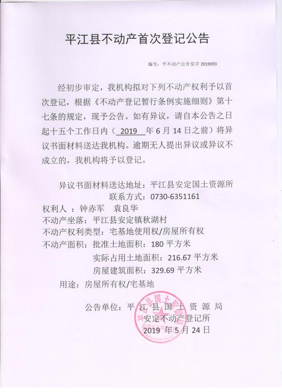 钟赤军 袁良华平江县不动产首次登记公告平不动产公告安字第2019093号