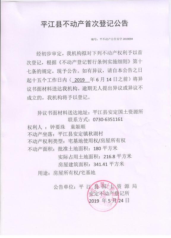 钟要珠 童姬顺平江县不动产首次登记公告平不动产公告安字第2019094号
