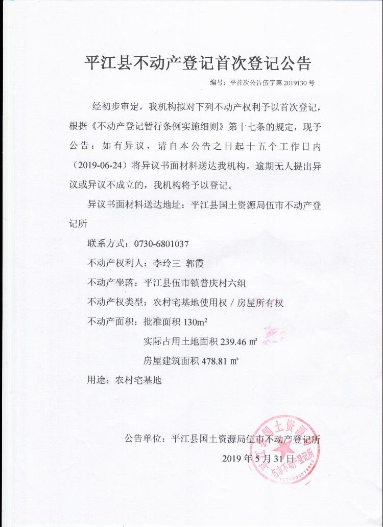 李玲三 郭霞平江县不动产首次登记公告平首次公告伍字第2019130号