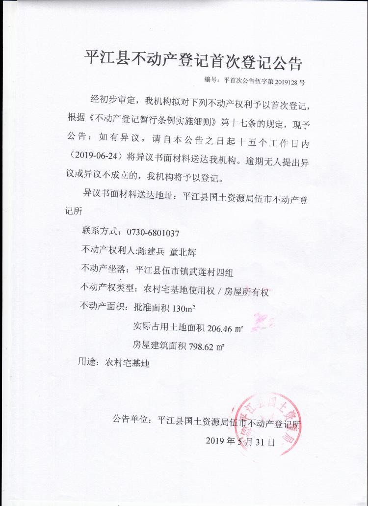 陈建兵 童北辉平江县不动产首次登记公告平首次公告伍字第2019128号