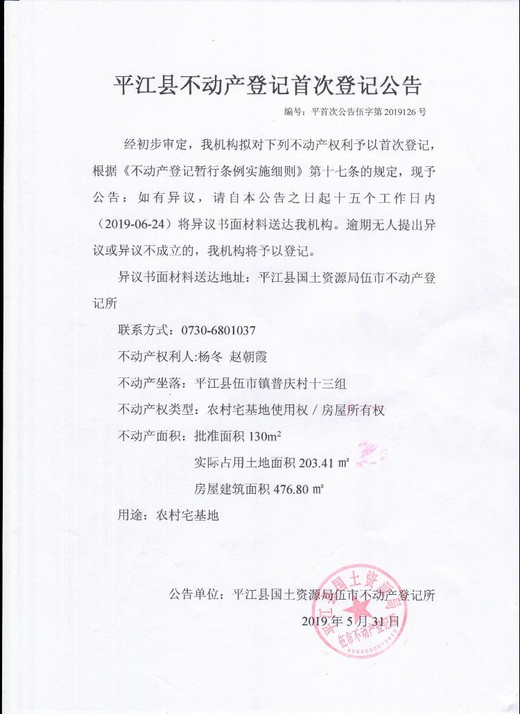 杨冬 赵朝霞平江县不动产首次登记公告平首次公告伍字第2019126号