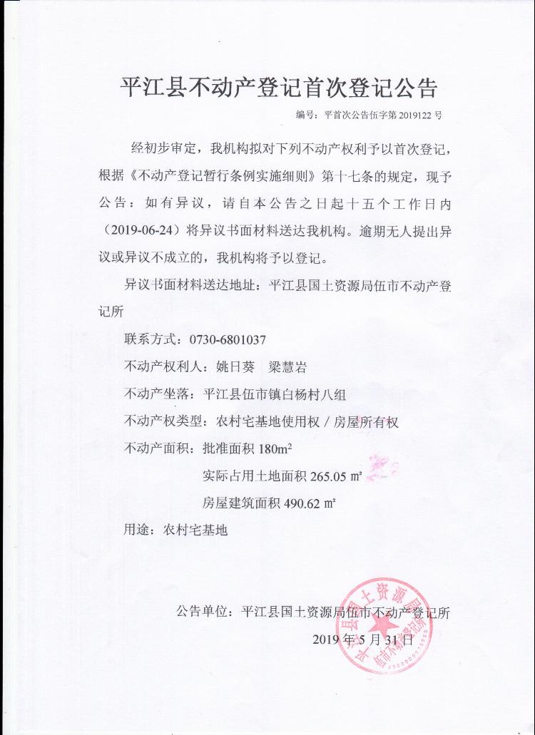 姚日葵 梁慧岩平江县不动产首次登记公告平首次公告伍字第2019122号