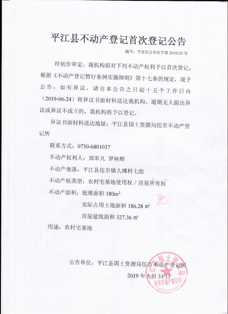 郑军凡 罗林辉平江县不动产首次登记公告平首次公告伍字第2019125号