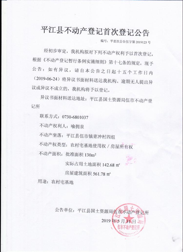 喻拥泉平江县不动产首次登记公告平首次公告伍字第2019123号