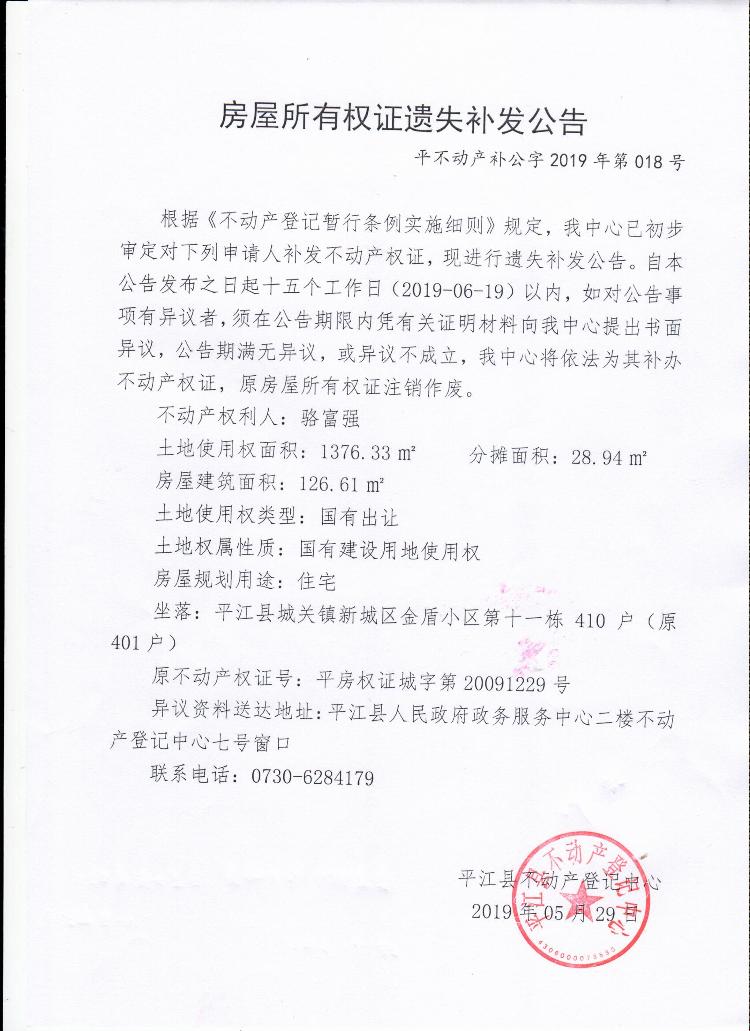 骆富强房屋所有权证遗失补发公告平不动产补公字2019年第018号