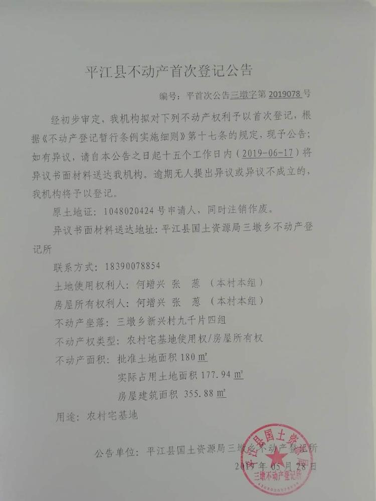 何增兴 张葱平江县不动产首次登记公告平首次公告三墩字第2019078号
