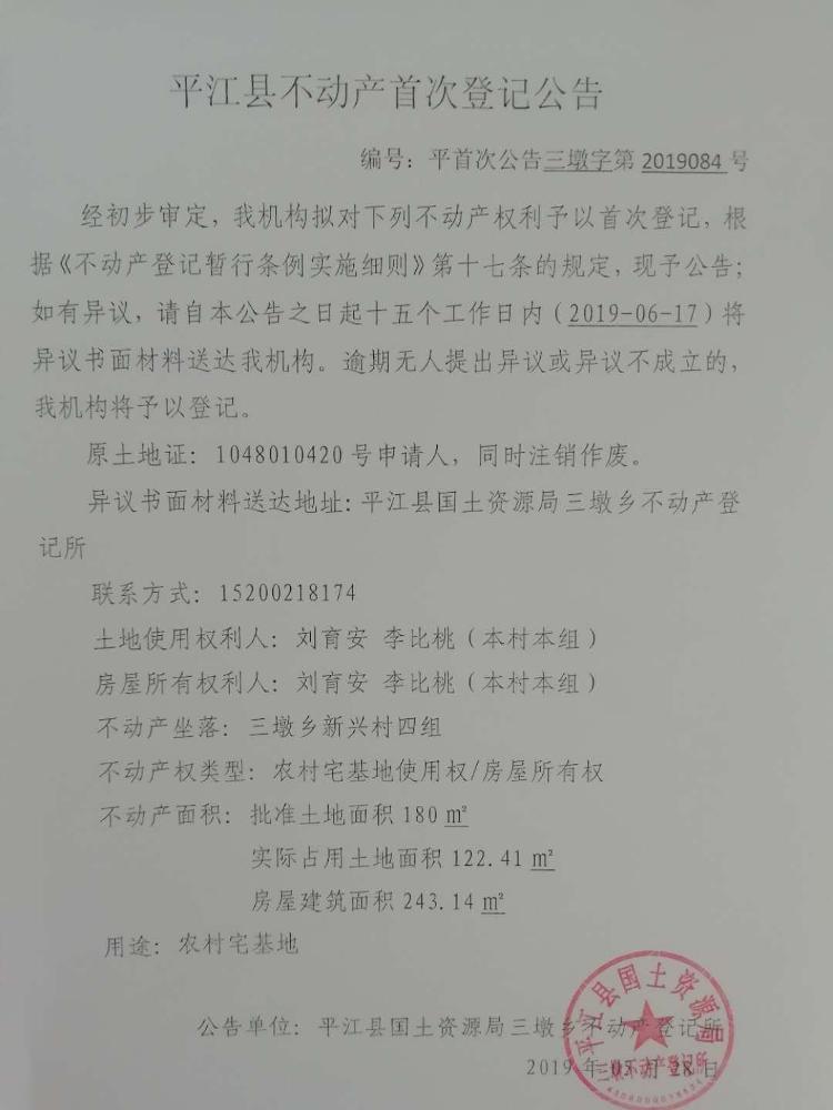刘育安 李比桃平江县不动产首次登记公告平首次公告三墩字第2019084号