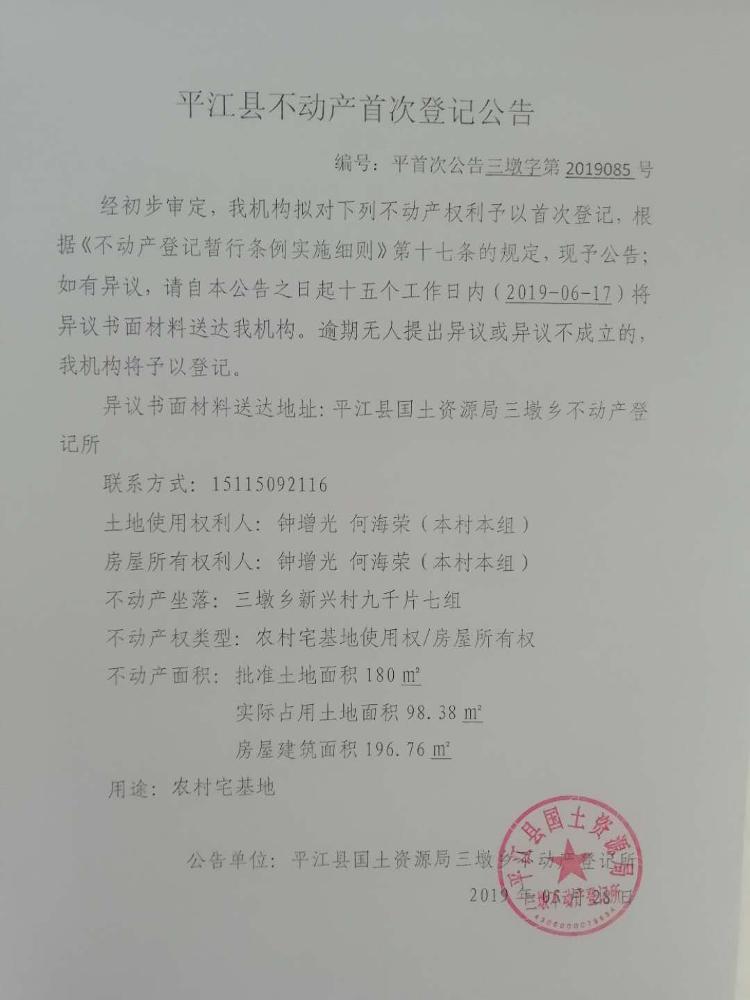 李其心 苏白英平江县不动产首次登记公告平首次公告三墩字第2019085号