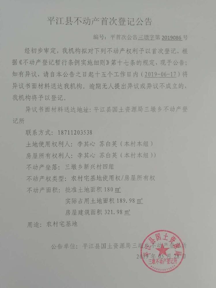 李其心 苏白英平江县不动产首次登记公告平首次公告三墩字第2019086号