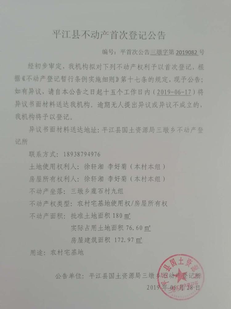 徐轩湘 李好菊平江县不动产首次登记公告平首次公告三墩字第2019082号