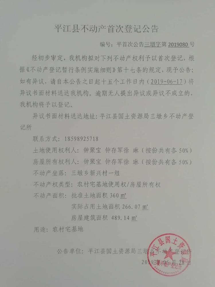钟聚宝 钟存军 徐琳平江县不动产首次登记公告平首次公告三墩字第2019080号