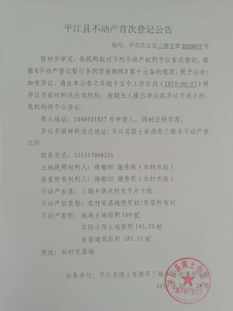 徐郁初 谢秀荣平江县不动产首次登记公告平首次公告三墩字第2019077号