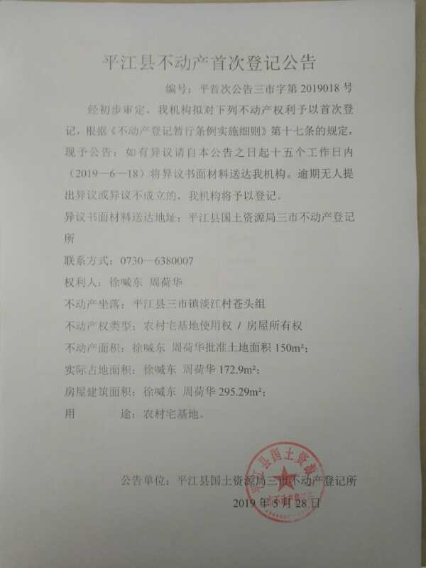徐喊东 周荷华平江县不动产首次登记公告平首次公告三市字第20190018号