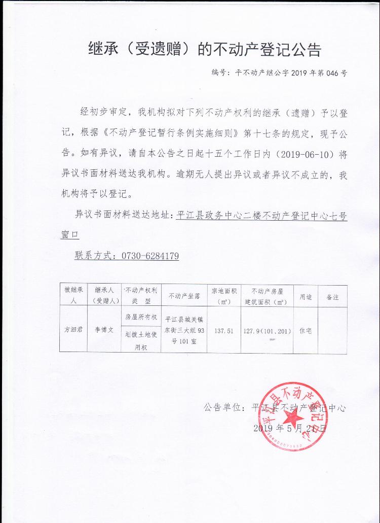 李博文继承(受遗赠)的不动产登记公告平不动产继公字2019年第046号