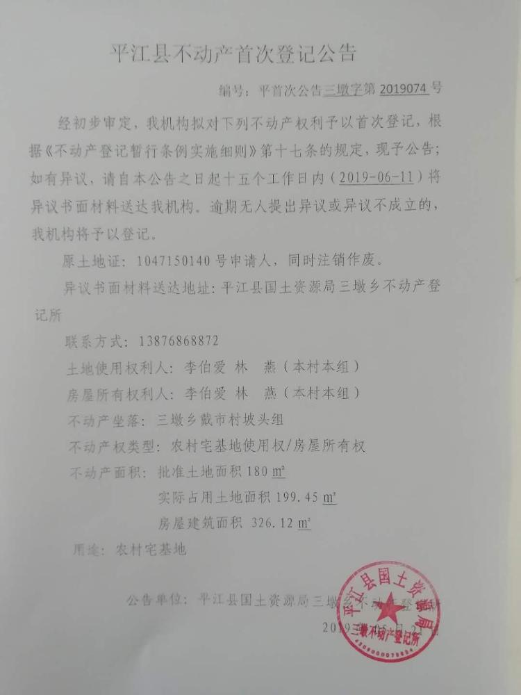 李伯爱 林燕平江县不动产首次登记公告平首次公告三墩字第2019074号
