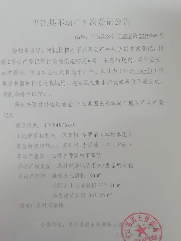 苏长根 李罗菊平江县不动产首次登记公告平首次公告三墩字第2019069号