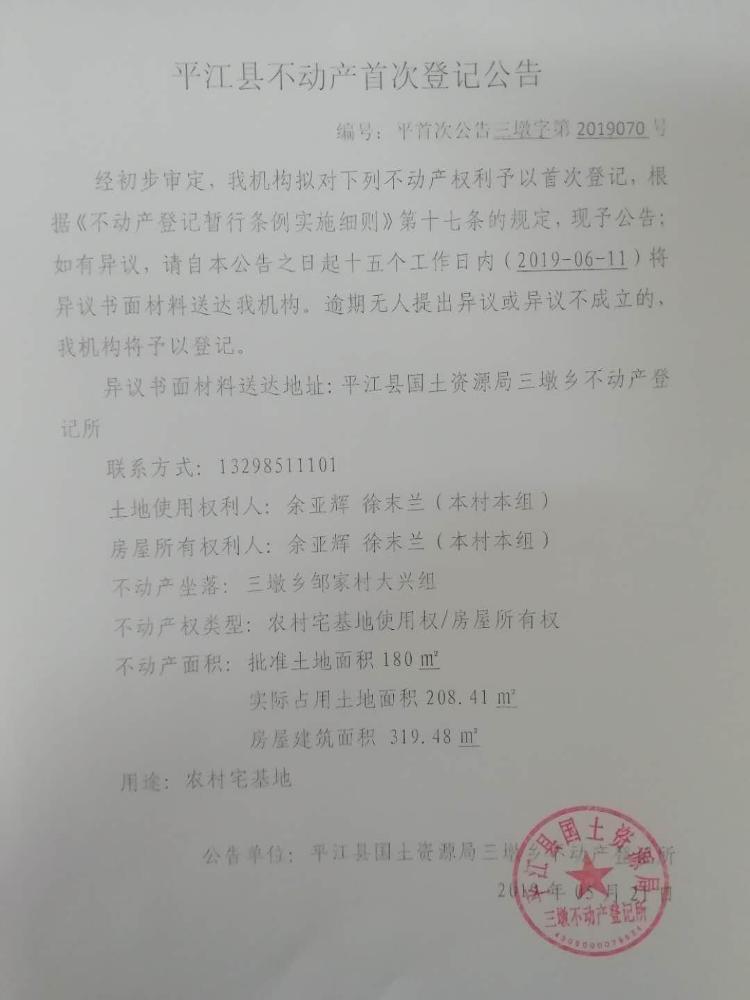 余亚辉 徐末兰平江县不动产首次登记公告平首次公告三墩字第2019070号
