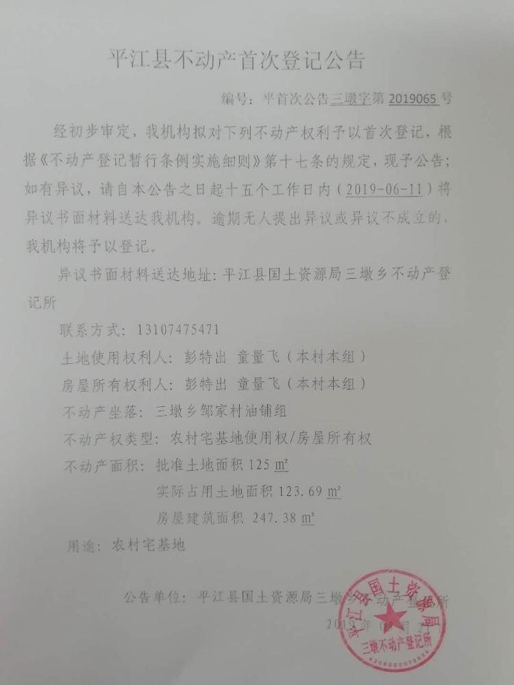 彭特出 童量飞平江县不动产首次登记公告平首次公告三墩字第2019065号
