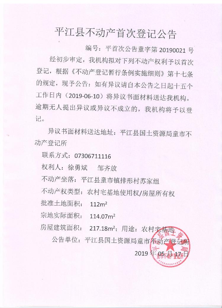 徐勇斌 邹齐放平江县不动产首次登记公告平首次公告童字第20190021号