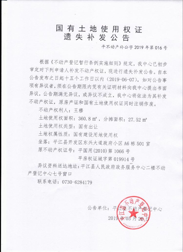 王穆土地所有权证遗失补发公告平不动产补公字2019年第016号