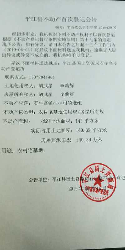 胡武星 李籁辉平江县不动产首次登记公告平首次公告石字第2019029号