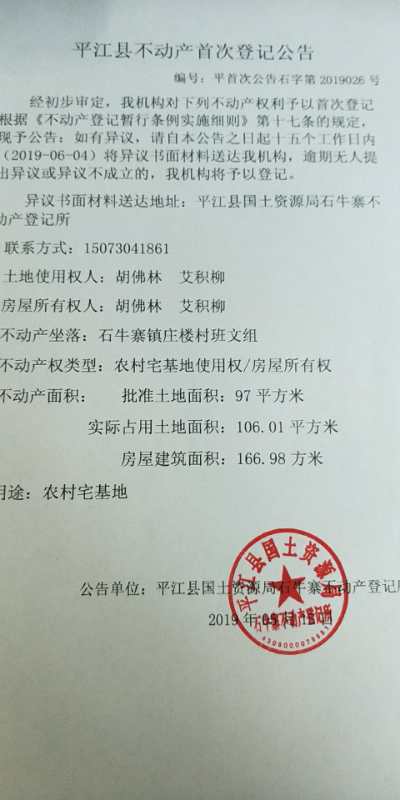 胡佛林 艾积柳平江县不动产首次登记公告平首次公告石字第2019026号