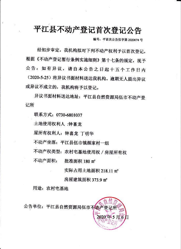 钟喜龙 丁明华平江县不动产首次登记公告伍字第2020074号