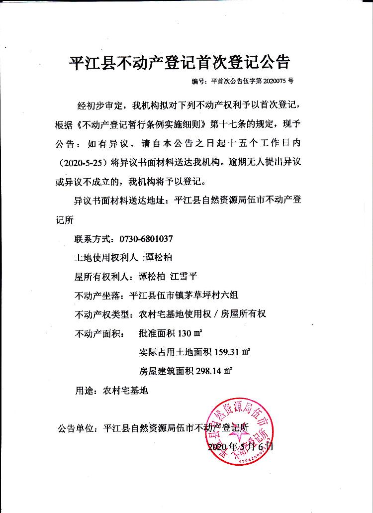 谭松柏 江雪平 平江县不动产首次登记公告伍字第2020075号
