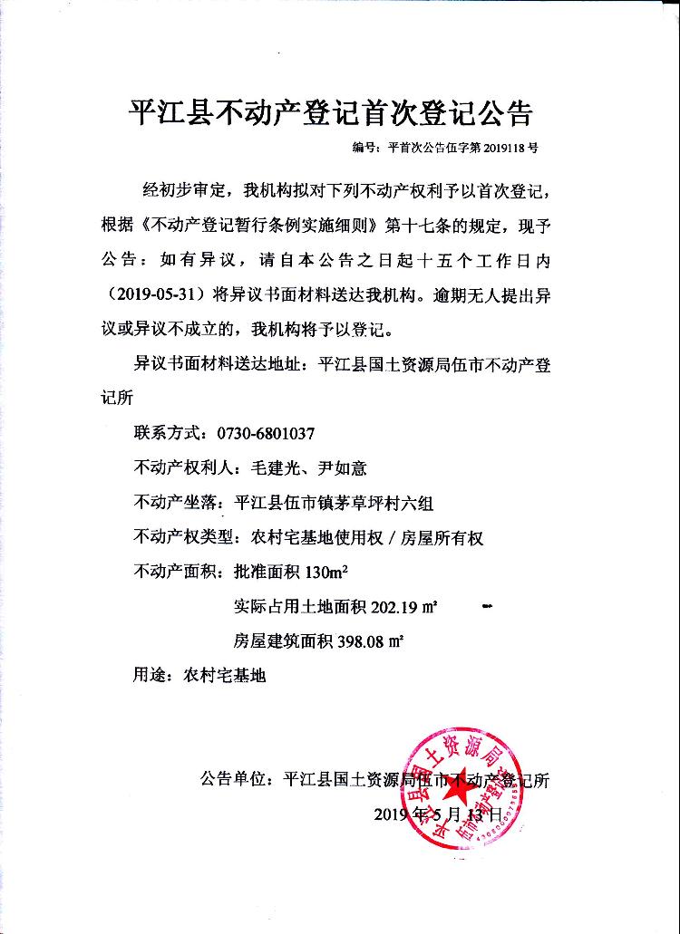 毛建光 尹如意 不动产首次登记公告 伍字第2019118号