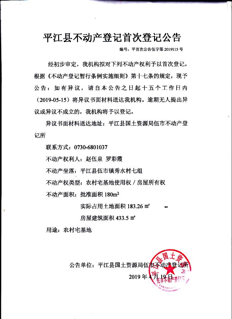 赵伍泉 罗彩霞 不动产首次登记公告伍字第2019115号