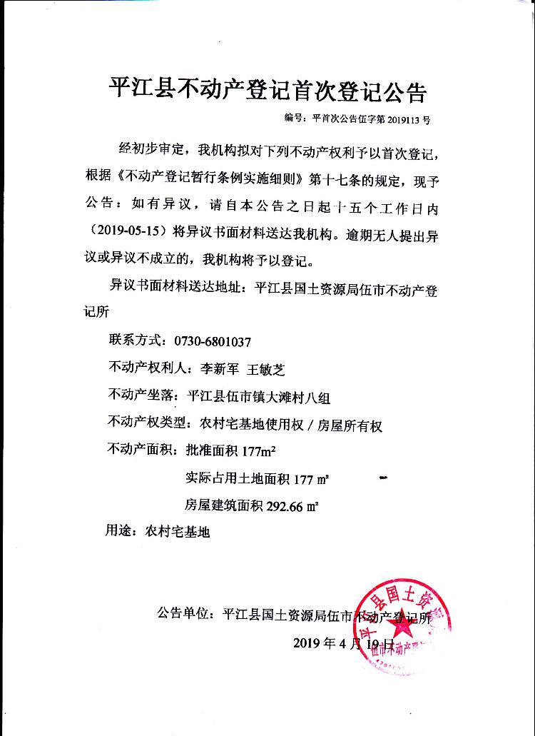 李新军 王敏芝 不动产首次登记公告 伍字第2019113号