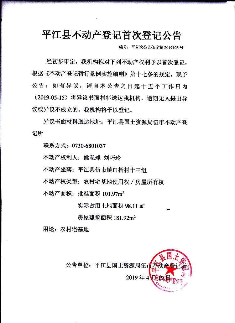 姚私球 刘巧玲 不动产首次登记公告 伍字第2019106号