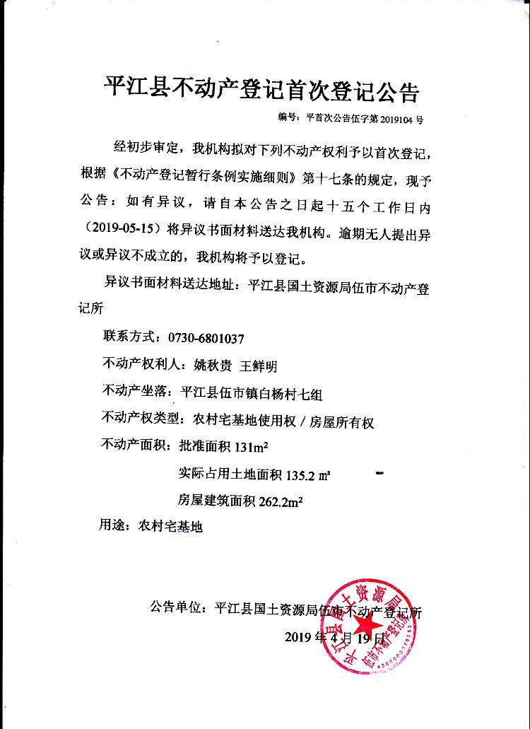 姚秋贵 王鲜明 不动产首次登记公告伍字第2019104号