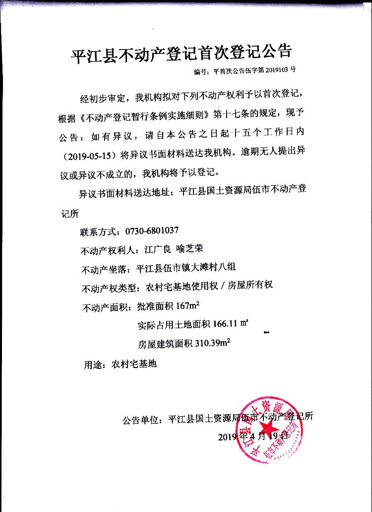 江广良 喻芝荣 不动产首次登记公告伍字第2019103号